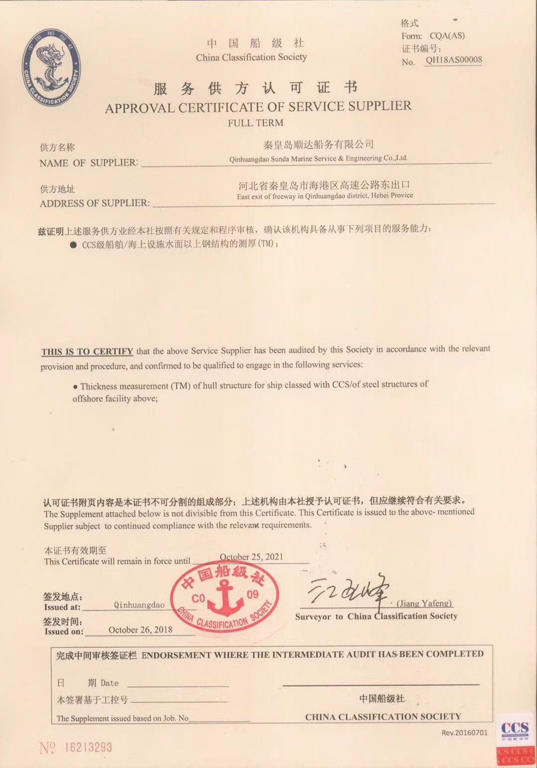 秦皇島順達船務有限公司位于美麗的海濱城市、中國北方著名的能源輸出大港--秦皇島。公司從事于船舶修理、物料供應、水下檢測、船體測厚、消防救生設備及救生艇檢驗、電氣自動化修理等服務。 公司自1997年成立至今,先后為國內外船東修理、檢驗各類船舶萬余艘,積累了豐富的施工經驗。公司現有場地100余畝,員工30余人,以及工程用車若干臺。我們公司一直本著嚴以律己、真誠待人、精益求精、信譽至上的經營理念,以優質的服務、專業的施工、合理的收費,得到了國內外船東的廣泛認可,贏得了良好的口碑和信譽。 公司已取得了中國船級社(CCS)、美國船級社(ABS)、日本船級社(NK)、德國船級社(DNV GL)等各個船級社的消防救生和救生艇檢驗資質, ...